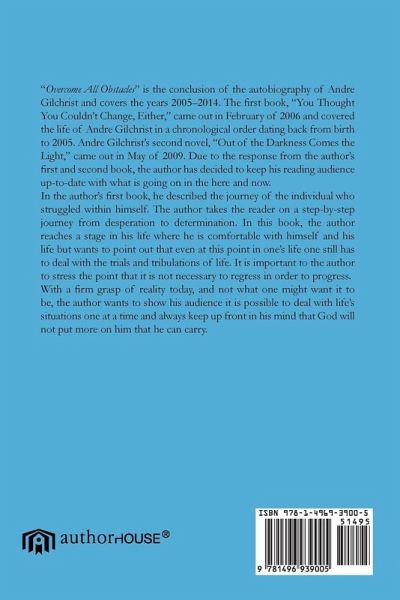 ?Overcome All Obstacles? is the conclusion of the autobiography of Andre Gilchrist and covers the years 2005?2014. The first book, ?You Thought You Couldn?t Change, Either,? came out in February of 2006 and covered the life of Andre Gilchrist in a chronological order dating back from birth to 2005. Andre Gilchrist?s second novel, ?Out of the Darkness Comes the Light,? came out in May of 2009. Due to the response from the author?s first and second book, the author has decided to keep his reading audience up-to-date with what is going on in the here and now. In the author?s first book, he described the journey of the individual who struggled within himself. The author takes the reader on a step-by-step journey from desperation to determination. In this book, the author reaches a stage in his life where he is comfortable with himself and his life but wants to point out that even at this point in one?s life one still has to deal with the trials and tribulations of life. It is important to the author to stress the point that it is not necessary to regress in order to progress. With a firm grasp of reality today, and not what one might want it to be, the author wants to show his audience it is possible to deal with life?s situations one at a time and always keep up front in his mind that God will not put more on him that he can carry.