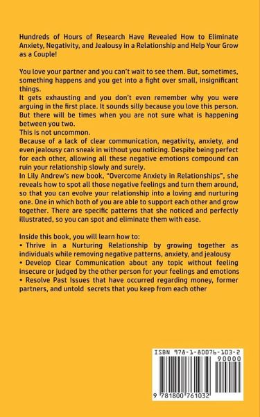 Hundreds of Hours of Research Have Revealed How to Eliminate Anxiety, Negativity, and Jealousy in a Relationship and Help Your Grow as a Couple! You love your partner and you can't wait to see them. But, sometimes, something happens and you get into a fight over small, insignificant things. It gets exhausting and you don't even remember why you were arguing in the first place. It sounds silly because you love this person. But there will be times when you are not sure what is happening between you two. This is not uncommon. Because of a lack of clear communication, negativity, anxiety, and even jealousy can sneak in without you noticing. Despite being perfect for each other, allowing all these negative emotions compound can ruin your relationship slowly and surely. In Lily Andrew's new book, "Overcome Anxiety in Relationships", she reveals how to spot all those negative feelings and turn them around, so that you can evolve your relationship into a loving and nurturing one. One in which both of you are able to support each other and grow together. There are specific patterns that she noticed and perfectly illustrated, so you can spot and eliminate them with ease. Inside this book, you will learn how to: Thrive in a Nurturing Relationship by growing together as individuals while removing negative patterns, anxiety, and jealousy Develop Clear Communication about any topic without feeling insecure or judged by the other person for your feelings and emotions Resolve Past Issues that have occurred regarding money, former partners, and untold secrets that you keep from each other If you have already tried solving your issues by yourself and it still didn't work, or if you already went through a book that simply points out your negative behaviors without providing any real-world solutions, don't worry. You never had a proper map to show you how to solve it. This book gives you a precise action plan, so that you and your partner can thrive in your relationship for better or for worse.