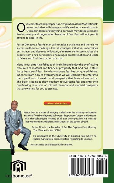 ABOUT THE BOOK overcome fear and prosper divine- way out: is an inspirational and motivational prayer book that will change your life. We live in a world where there is an overabundance of everything our souls may desire yet many live in poverty and degradation because of fear. Fear will not permit anyone to excel in life. Pastor Don, says, a fearful man will not take a challenge and there is no success without a challenge. Fear discourages initiative, undermines enthusiasm and destroy will power, eliminates self-esteem, takes the beauty from one's personality, encourage procrastination and leads to failure and final destruction of a man. This book will show you how to overcome fear and enter into overflowing resources of spiritual, financial and materials prosperity that are waiting for you to tap into. Pastor Don has released a combination of prayers and inspirational words that will liberate you from every form of fear or phobia into an overflowing abundance of wealth and prosperity.
