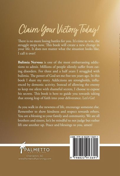 Claim Your Victory Today! There is no more losing battles for you. It's time to win, the struggle stops now. This book will create a new change in your life. It does not matter what the situation looks like, I call it over! Bulimia Nervosa is one of the most embarrassing addictions to admit. Millions of people silently suffer from eating disorders. For three and a half years I struggled with bulimia. The power of God set me free ten years ago. In this book I share my story. Addictions are strongholds, influenced by demonic activity. Instead of allowing the enemy to keep me silent with shameful secrets, I choose to expose his secrets. This book is here to guide you towards taking that strong leap of faith into your deliverance. Let's Go! As you walk in the newness of life, encourage someone else. Remember to show kindness and respect towards others. You are a blessing to your family and community. We are all brothers and sisters, let's be mindful to not judge but rather lift one another up. Peace and blessings to you, amen!