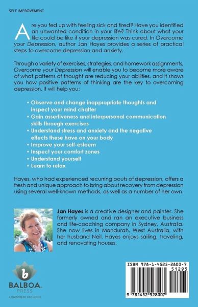 Are you fed up with feeling sick and tired? Have you identified an unwanted condition in your life? Think about what your life could be like if your depression was cured. In Overcome your Depression, author Jan Hayes provides a series of practical steps to overcome depression and anxiety. Through a variety of exercises, strategies, and homework assignments, Overcome your Depression will enable you to become more aware of what patterns of thought are reducing your abilities, and it shows you how positive patterns of thinking are the key to overcoming depression. It will help you: ¿ Observe and change inappropriate thoughts and inspect your mind chatter ¿ Gain assertiveness and interpersonal communication skills through exercises ¿ Understand stress and anxiety and the negative effects these have on your body ¿ Improve your self-esteem ¿ Inspect your comfort zones ¿ Understand yourself ¿ Learn to relax Hayes, who had experienced recurring bouts of depression, offers a fresh and unique approach to bring about recovery from depression using several well-known methods, as well as a number of her own.