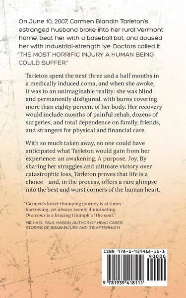 On June 10, 2007, Carmen Blandin Tarleton's estranged husband broke into her rural Vermont home, beat her with a baseball bat, and doused her with industrial-strength lye. Doctors called it "THE MOST HORRIFIC INJURY A HUMAN BEING COULD SUFFER." Tarleton spent the next three and a half months in a medically induced coma, and when she awoke, it was to an unimaginable reality: she was blind and permanently disfigured, with burns covering more than eighty percent of her body. Her recovery would include months of painful rehab, dozens of surgeries, and total dependence on family, friends, and strangers for physical and financial care. With so much taken away, no one could have anticipated what Tarleton would gain from her experience: an awakening. A purpose. Joy. By sharing her struggles and ultimate victory over catastrophic loss, Tarleton proves that life is a choice-and, in the process, offers a rare glimpse into the best and worst corners of the human heart. "CARMEN IS SO UNFLINCHINGLY HONEST, SO TRANSPARENT . . . Overcome: Burned, Blinded, and Blessed is an opportunity to bask, for just for a little while, in the rays of her exceptional spirit." -JONI BUSBY, SUPERVISING PRODUCER, THE DOCTORS "Carmen's story is one of tragedy and triumph. She is truly an example of the strength and beauty of the human spirit. Carmen went from victim to survivor and teaches us all that we can overcome the unimaginable and create the lives we would like to live." ¿JENNIFER RADICS, MBA EXECUTIVE DIRECTOR, ALISA ANN RUCH BURN FOUNDATION "Carmen Tarleton's story is a riveting account of a courageous woman who teaches us all the power of fighting suffering with relentless hope and tenacity." ¿SAMIR MELKI, MD, PHD FOUNDER, BOST ON EYE GROUP "Carmen tells her inspiring story with remarkable clarity and honesty. She has endured a journey many might be unable to endure and arrived to provide the reader with wisdom, compassion, and inspiration. As heavy as the price was for Carmen, Overcome is a wonderful gift to those of us who take the time to read it. Her story is, at heart, one of a profound and courageous journey, and she has arrived with great treasures to offer us all." ¿DAVID VOGEL PRESIDENT, BURN SURVIVORS OF NEW ENGLAND "Told with sincerity and grace, Overcome powerfully illustrates the unlimited resilience of the human spirit. Carmen's heart-thumping journey is at times harrowing, yet always keenly illuminating. Overcome is a bracing triumph of the soul." ¿MICHAEL PAUL MASON AUTHOR OF HEAD CASES: STORIES OF BRAIN INJURY AND ITS AFTERMATH