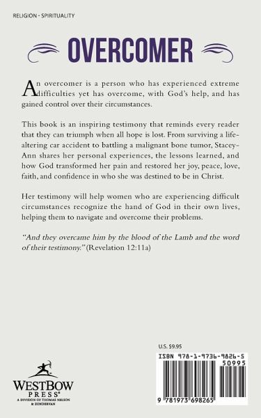 An overcomer is a person who has experienced extreme difficulties yet has overcome, with God's help, and has gained control over their circumstances. This book is an inspiring testimony that reminds every reader that they can triumph when all hope is lost. From surviving a life-altering car accident to battling a malignant bone tumor, Stacey-Ann shares her personal experiences, the lessons learned, and how God transformed her pain and restored her joy, peace, love, faith, and confidence in who she was destined to be in Christ. Her testimony will help women who are experiencing difficult circumstances recognize the hand of God in their own lives, helping them to navigate and overcome their problems. "And they overcame him by the blood of the Lamb and the word of their testimony." (Revelation 12:11a)