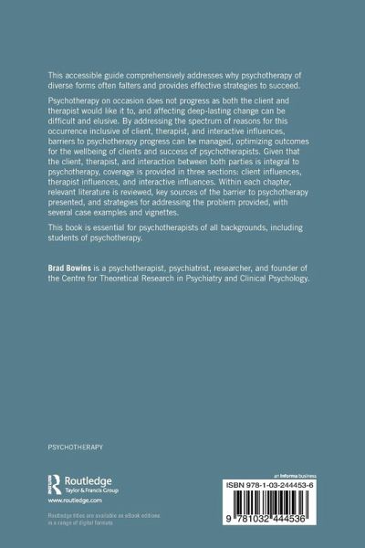 Psychotherapy on occasion does not progress as both the client and therapist would like it to, and affecting deep-lasting change can be difficult and elusive. By addressing the spectrum of reasons for this occurrence inclusive of client, therapist, and interactive influences, barriers to psychotherapy progress can be managed, optimizing outcomes for the wellbeing of clients and success of psychotherapists. Given that the client, therapist, and interaction between both parties is integral to psychotherapy, coverage is provided in three sections: client influences, therapist influences, and interactive influences. Within each chapter, relevant literature is reviewed, key sources of the barrier to psychotherapy presented, and strategies for addressing the problem provided, with several case examples and vignettes.