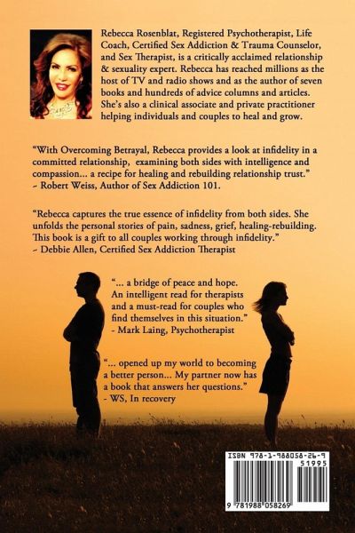 About the Author of Overcoming Betrayal: Rebecca Rosenblat, Registered Psychotherapist, Life Coach, Certified Sex Addiction & Trauma Counselor, and Sex Therapist, is a critically acclaimed relationship & sexuality expert. Rebecca has reached millions as the host of TV and radio shows and as the author of seven books and hundreds of advice columns and articles. She’s also a clinical associate and private practitioner helping individuals and couples to heal and grow. "When a betrayal rocks a relationship – be it due to an affair or sex addiction – the couple needs to work together to get through it. But feeling hurt, upset, and afraid dissuades both parties from being exposed and vulnerable to each other – the very ingredients that are critical to healing. This book is intended to bring both parties together, by understanding each other’s mindset, feeling each other’s pain, and finding the answers that couples look for when their world has been blown apart." - Rebecca Rosenblat, psychotherapist, relationship-sexuality therapist, best-selling author and TV host. "I appreciated Rebecca’s openness to discuss infidelity from both perspectives. I believe she’s the first to walk through the process holding both realities together, while doing an amazing job informing couples of issues to address, as well as giving them a roadmap to address these issues. Anyone who has experienced infidelity would do well to read Overcoming Betrayal." ~ Dr. Douglas Weiss, President of the American Association for Sex Addiction Therapy (AASAT) With Overcoming Betrayal, Rebecca provides a look at infidelity in a committed relationship, examining both sides with intelligence and compassion... a recipe for healing and rebuilding relationship trust." ~ Robert Weiss, Author of Sex Addiction 101. "Rebecca captures the true essence of infidelity from both sides. She unfolds the personal stories of pain, sadness, grief, healing-rebuilding. This book is a gift to all couples working through infidelity." ~ Debbie Allen, Certified Sex Addiction Therapist "... a bridge of peace and hope. An intelligent read for therapists and a must-read for couples who find themselves in this situation." - Mark Laing, Psychotherapist "... opened up my world to becoming a better person... My partner now has a book that answers her questions." - WS, In recovery