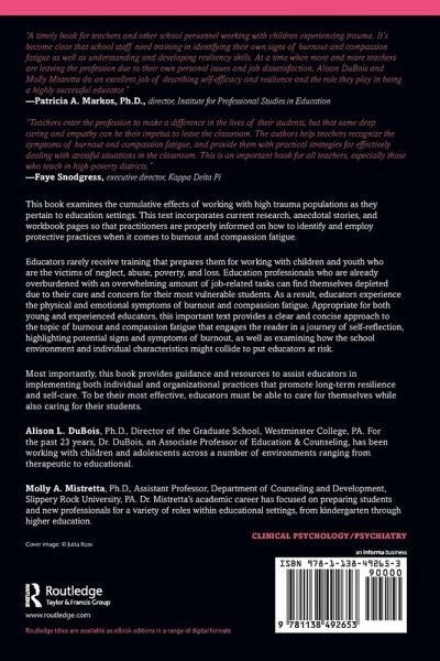 This book examines the cumulative effects of working with high trauma populations as they pertain to education settings. This text incorporates current research, anecdotal stories, and workbook pages so that practitioners are properly informed on how to identify and employ protective practices when it comes to burnout and compassion fatigue. Educators rarely receive training that prepares them for working with children and youth who are the victims of neglect, abuse, poverty, and loss. Education professionals who are already overburdened with an overwhelming number of job-related tasks can find themselves depleted due to their care and concern for their most vulnerable students. As a result, educators experience the physical and emotional symptoms of burnout and compassion fatigue. Appropriate for both young and experienced educators, this important text provides a clear and concise approach to the topic of burnout and compassion fatigue that engages the reader in a journey of self-reflection, highlighting potential signs and symptoms of burnout, as well as examining how the school environment and individual characteristics might collide to put educators at risk. Most importantly, this book provides guidance and resources to assist educators in implementing both individual and organizational practices that promote long-term resilience and self-care. To be at their most effective, educators must be able to care for themselves while also caring for their students.