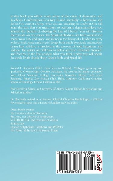 In this book you will be made aware of the cause of depression and its effects. Confrontation is victory-Passive mentality is depression and defeat.You cannot change what you are unwilling to confront.You will learn the laws that you must obey to overcome depression.Have you learned the benefits of obeying the Law of Liberty? You will discover them inside.Are you aware that Spiritual blindness are both suicidal and murderous. Law and grace and mercy is too heavy of a burden to carry without faith, justice, and mercy brings both death by suicide and murder. Learn how self-love is involved in the process of both happiness and sadness. The spirits you will have to defeat are Fear- Defeated- worried- and Poverty. In the final analysis what you think is what you will speak, So speak Truth, Speak Hope, Speak Faith, and Speak life. Ronald F. Beckwith (1943- ) was born in Hillsdale, Michigan, grew up and graduated Owosso High, Owosso, Michigan. He received his higher education from Olivet Nazarene College (University, Kankakee, Illinois, Gulf Coast Seminary, Panama City, Florida (Th.B, Th.M). Southern California Graduate School of Theology, Fersno, California, Ph.D. Post Doctrinal Studies at University Of Miami, Miami, Florida. (Counseling and Addiction Studies) Dr. Beckwith retired as a Licensed Clinical Christian Psychologist, a Clinical Psychopathologist, and a Doctor of Addictions Counselor. Other books written: The Creator's plan for Recovery Recovery is a Lifestyle of Forgiveness. SOTERIOLOGY: The Doctrine of Yeshua Sunday Law Expos'e of Ephesians, Galations, and 1&2Peter The Power of the Law in Answered Prayer