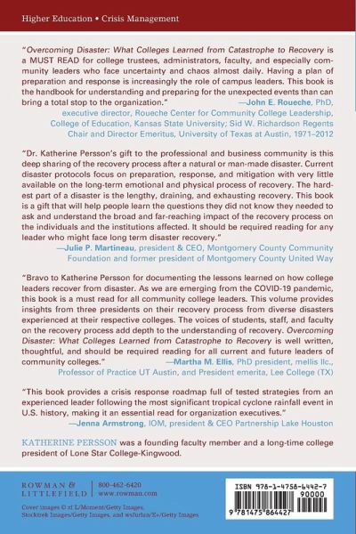 Dedication Preface Acknowledgements Introduction Part 1: What Happened Chapter 1: Lone Star College-Kingwood Chapter 2: Gulf Coast State College Chapter 3: Umpqua Community College Part II: Hindsight: What We Wish We Knew Chapter 4: The Settings Chapter 5: Don't Be Naïve Chapter 6: Guns, Drugs and Money Chapter 7: Power Chapter 8: Move Things to a Higher Place Chapter 9: Identity Theft Chapter 10: Loss of Personal Items and Loss of Lives Chapter 11: What You Should Know and Do to Help Recovery Efforts Part III: What Helped Us Chapter 12: Leadership Team Chapter 13: Culture Chapter 14: Policies Chapter 15: Resources Chapter 16: Friends, Partners, and Others Wanting to Help Part IV: What Hindered Us Chapter 17: Inexperience Chapter 18: FEMA and Other Bureaucracies Chapter 19: Procurement Policies Chapter 20: Personnel Changes Part V: Aftermath to Recovery Chapter 21: Trauma and Grief Chapter 22: Overwhelming State of Mind Chapter 23: Healing and Recovering Chapter 24: Recovery Strategies Used by Individuals Chapter 25: Recovery Strategies Used Organizations Chapter 26: Community Healing Part VI: Preparation for the Next Crisis - A Global Pandemic Part VII: Master Crisis Response Cheat Sheet Closing Statement Appendix A:Harvey Timeline Summary: August 23, 2017 - February 2020 Appendix B.LSC-Kingwood Student Success Pre and Post Harvey Appendix C:Harvey Revenues and Expenses Appendix D:LSC Procurement Process Appendix E:Testimonials from Student, Staff, and Faculty References About the Author About the Contributors