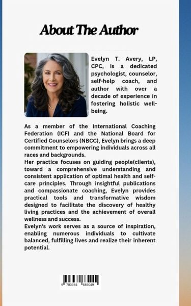 Evelyn T. Avery, LP, CPC, is a dedicated psychologist, counselor, self-help coach, and author with over a decade of experience in fostering holistic well-being. As a member of the International Coaching Federation (ICF) and the National Board for Certified Counselors (NBCC), Evelyn brings a deep commitment to empowering individuals across all races and backgrounds. Her practice focuses on guiding people(clients), toward a comprehensive understanding and consistent application of optimal health and self-care principles. Through insightful publications and compassionate coaching, Evelyn provides practical tools and transformative wisdom designed to facilitate the discovery of healthy living practices and the achievement of overall wellness, and success. Evelyn's work serves as a source of inspiration, enabling numerous individuals to cultivate balanced, fulfilling lives and realize their inherent potential.