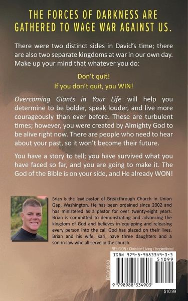 The forces of darkness are gathered to wage war against us. There were two distinct sides in David's time; there are also two separate kingdoms at war in our own day. Make up your mind that whatever you do: Don't quit! If you don't quit, you WIN! Overcoming Giants in Your Life will help you determine to be bolder, speak louder, and live more courageously than ever before. These are turbulent times; however, you were created by Almighty God to be alive right now. There are people who need to hear about your past, so it won't become their future. You have a story to tell; you have survived what you have faced so far, and you are going to make it. The God of the Bible is on your side, and He already WON!