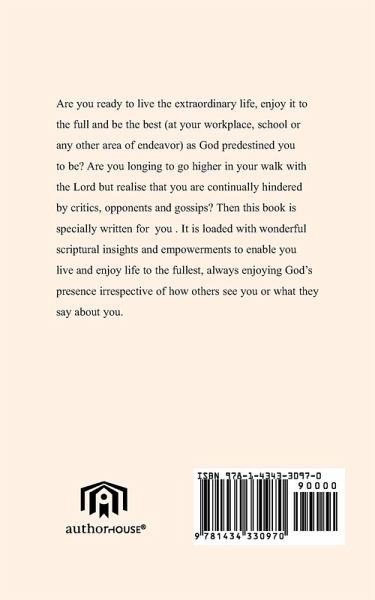Are you ready to live the extraordinary life, enjoy it to the full and be the best (at your workplace, school or any other area of endeavor) as God predestined you to be? Are you longing to go higher in your walk with the Lord but realise that you are continually hindered by critics, opponents and gossips? Then this book is specially written for you . It is loaded with wonderful scriptural insights and empowerments to enable you live and enjoy life to the fullest, always enjoying God's presence irrespective of how others see you or what they say about you.