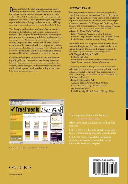 This therapist guide outlines a safe and effective treatment that targets the behavioral and cognitive components of insomnia. The program focuses on educating the patient about sleep, addressing unhelpful beliefs abou sleep, teaching ways to eliminate sleep disruptive habits, and calculating the patient's ideal time in bed.