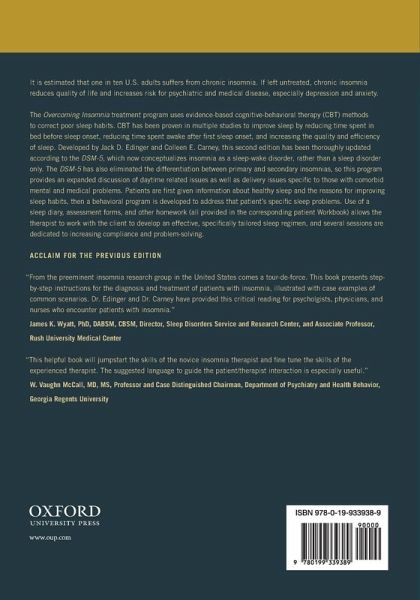 It is estimated that one in ten U.S. adults suffers from chronic insomnia. If left untreated, chronic insomnia reduces quality of life and increases risk for psychiatric and medical disease, especially depression and anxiety. The Overcoming Insomnia treatment program uses evidence-based cognitive-behavioral therapy (CBT) methods to correct poor sleep habits. CBT has been proven in multiple studies to improve sleep by reducing time spent in bed before sleep onset, reducing time spent awake after first sleep onset, and increasing the quality and efficiency of sleep. Developed by Jack D. Edinger and Colleen E. Carney, this second edition has been thoroughly updated according to the DSM-5, which now conceptualizes insomnia as a sleep-wake disorder, rather than a sleep disorder only. The DSM-5 has also eliminated the differentiation between primary and secondary insomnias, so this program provides an expanded discussion of daytime related issues as well as delivery issues specific to those with comorbid mental and medical problems. Patients are first given information about healthy sleep and the reasons for improving sleep habits, then a behavioral program is developed to address that patient's specific sleep problems. Use of a sleep diary, assessment forms, and other homework (all provided in the corresponding patient Workbook) allows client and therapist to work together to develop an effective sleep regimen tailored specifically for each client, and several sessions are dedicated to increasing compliance and problem-solving.