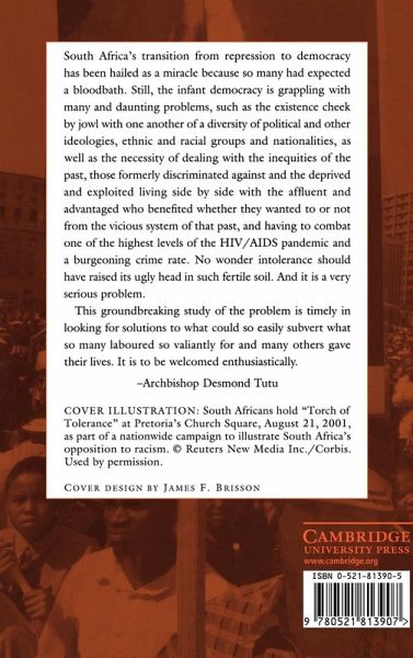 List of tables and figures Preface Part I. Introduction: 1. Political tolerance in the New South Africa 2. The South African context Part II. South African Intolerance as It Is: 3. The nature of political intolerance in South Africa 4. Social identities, threat perceptions and political intolerance 5. Making tolerance judgements: the effect of context, local and national Part III. South African Intolerance as It Might Be: 6. The persuasibility of tolerance and intolerance 7. The law and legal institutions as agents of persuasion 8. Becoming tolerant? Short-term changes in South African political culture 9. Conclusions: experimenting with tolerance in the New South Africa Appendix: research design and methodology References Index.