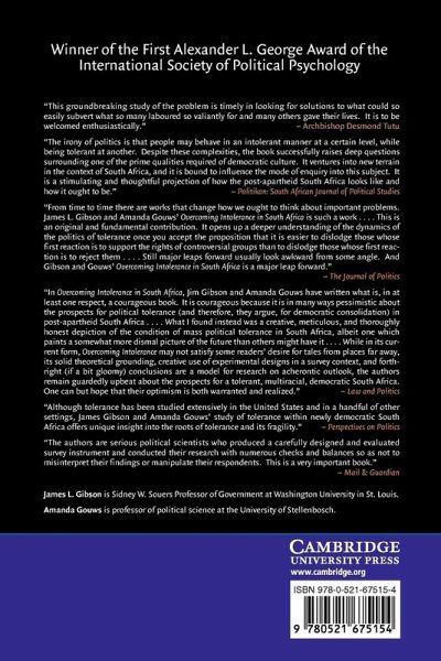 List of tables and figures Preface Part I. Introduction: 1. Political tolerance in the New South Africa 2. The South African context Part II. South African Intolerance as It Is: 3. The nature of political intolerance in South Africa 4. Social identities, threat perceptions and political intolerance 5. Making tolerance judgements: the effect of context, local and national Part III. South African Intolerance as It Might Be: 6. The persuasibility of tolerance and intolerance 7. The law and legal institutions as agents of persuasion 8. Becoming tolerant? Short-term changes in South African political culture 9. Conclusions: experimenting with tolerance in the New South Africa Appendix: research design and methodology References Index.