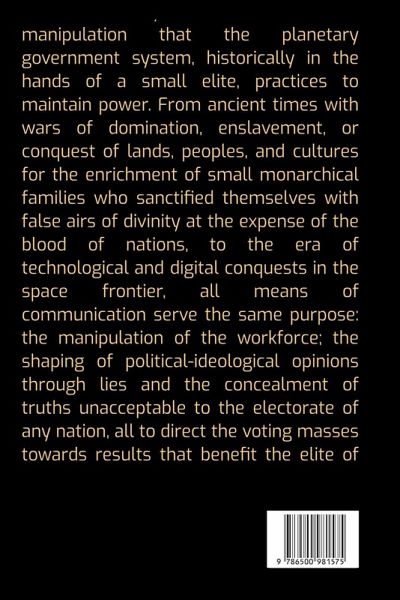 The book clearly addresses all forms of manipulation that the planetary government system, historically in the hands of a small elite, practices to ma