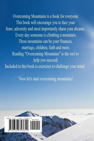 Overcoming Mountains is a book for everyone. This book will encourage you to face your fears, adversity and most importantly chase your dreams. Every day someone is climbing a mountain. These mountains can be your finances, marriage, children, faith and more. Reading "Overcoming Mountains" is the tool to help you succeed. Included in this book is exercises to challenge your mind. Now let's start overcoming mountains!