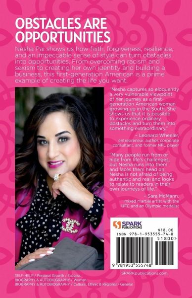 Obstacles Are Opportunities Nesha Pai shows us how faith, forgiveness, resilience, and an impeccable sense of style can turn obstacles into opportunities. From overcoming racism and sexism to creating her own identity and building a business, this first-generation American is a prime example of creating the life you want. "Nesha captures so eloquently a very vulnerable viewpoint of her journey as a first-generation American woman growing up in the South. She shows us that it is possible to experience ordinary obstacles and turn them into something extraordinary." - Leonard Wheeler, entrepreneur, author, corporate consultant, and former NFL player "Many people run from or hide from life's challenges, but Nesha runs into them and faces them head on. Nesha is not afraid of being authentic and real and looks to relate to readers in their own journeys of life." - Sara McMann, mixed martial artist with the UFC and an Olympic medalist