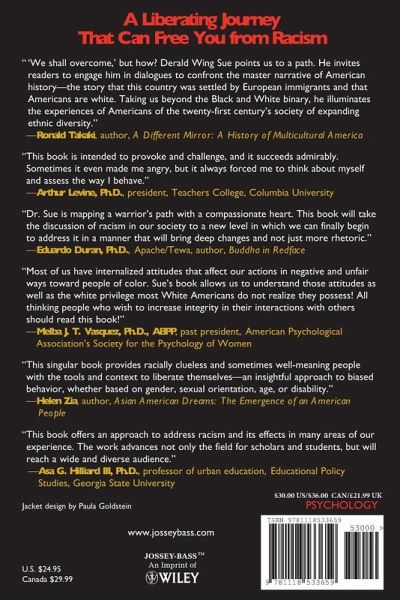 "'We shall overcome, ' but how? Derald Wing Sue points us to a path. He invites readers to engage him in dialogues to confront the master narrative of American history-- the story that this country was settled by European immigrants and that Americans are white.Taking us beyond the Black and White binary, he illuminates the experiences of Americans of the twenty-first century's society of expanding ethnic diversity." --Ronald Takaki, author, A Different Mirror: A History of Multicultural America "This book is intended to provoke and challenge, and it succeeds admirably. Sometimes it even made me angry, but it always forced me to think about myself and assess the way I behave." --Arthur Levine, Ph.D., president, Teachers College, Columbia University "Dr. Sue is mapping a warrior's path with a compassionate heart.This book will take the discussion of racism in our society to a new level in which we can finally begin to address it in a manner that will bring deep changes and not just more rhetoric." --Eduardo Duran, Ph.D., Apache/Tewa, author, Buddha in Redface "Most of us have internalized attitudes that affect our actions in negative and unfair ways toward people of color. Sue's book allows us to understand those attitudes as well as the white privilege most White Americans do not realize they possess! All thinking people who wish to increase integrity in their interactions with others should read this book!" --Melba J. T. Vasquez, Ph.D., ABPP, past president, American Psychological Association's Society for the Psychology of Women "This singular book provides racially clueless and sometimes well-meaning people with the tools and context to liberate themselves-- and the rest of us-- from their destructive ways. Though the book centers on racism and whiteness, it also gives an insightful approach to other biased behavior, whether based on gender, sexual orientation, age, disability, or other common markers of prejudice. Most important, this book offers all of us the hope that constructive change is not only possible but within our capacity to achieve." --Helen Zia, author, Asian American Dreams: The Emergence of An American People