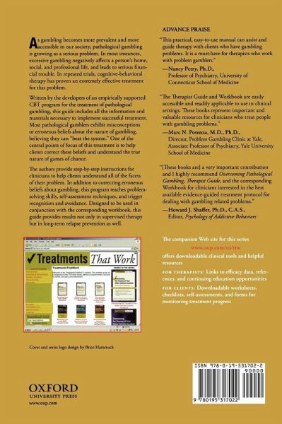 This Therapist Guide provides clinicians with session-by-session instructions for implementing an effective, CBT-based treatment for pathological gambling. The treatment outlined helps clients to not only overcome their problem, but also to deal with the many consequences of their excessive gambling including financial problems and interpersonal conflicts.