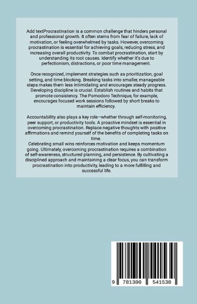 Procrastination is a common challenge that hinders personal and professional growth. It often stems from fear of failure, lack of motivation, or feeling overwhelmed by tasks. However, overcoming procrastination is essential for achieving goals, reducing stress, and increasing overall productivity. To combat procrastination, start by understanding its root causes. Identify whether it's due to perfectionism, distractions, or poor time management. Once recognized, implement strategies such as prioritization, goal setting, and time blocking. Breaking tasks into smaller, manageable steps makes them less intimidating and encourages steady progress. Developing discipline is crucial. Establish routines and habits that promote consistency. The Pomodoro Technique, for example, encourages focused work sessions followed by short breaks to maintain efficiency. Accountability also plays a key role-whether through self-monitoring, peer support, or productivity tools. A proactive mindset is essential in overcoming procrastination. Replace negative thoughts with positive affirmations and remind yourself of the benefits of completing tasks on time. Celebrating small wins reinforces motivation and keeps momentum going. Ultimately, overcoming procrastination requires a combination of self-awareness, structured planning, and persistence. By cultivating a disciplined approach and maintaining a clear focus, you can transform procrastination into productivity, leading to a more fulfilling and successful life.