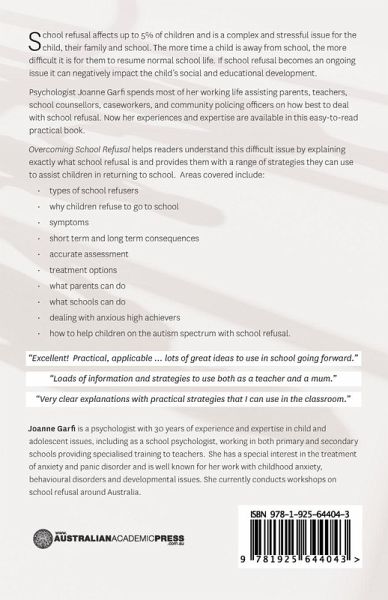 School refusal affects up to 5% of children and is a complex and stressful issue for the child, their family and school. Psychologist Joanne Garfi spends most of her working life assisting parents, teachers, school counsellors, caseworkers, and community policing officers on how best to deal with school refusal. Now her experiences and expertise are available in this easy-to-read practical book.