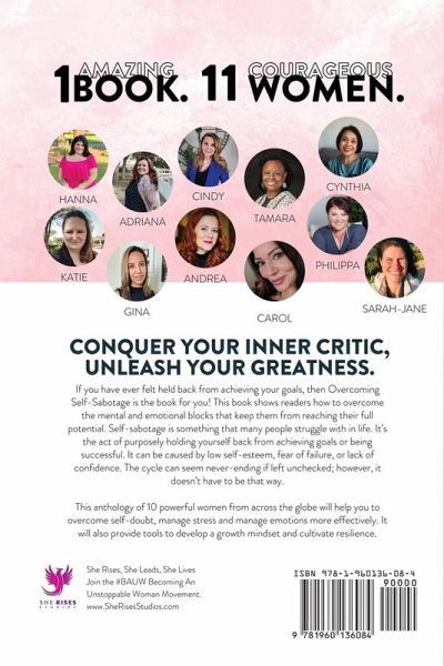 If you have ever felt held back from achieving your goals, then Overcoming Self-Sabotage is the book for you! This book shows readers how to overcome the mental and emotional blocks that keep them from reaching their full potential. This anthology of 10 powerful women from across the globe will help you to overcome self-doubt, manage stress and manage emotions more effectively. It will also provide tools to develop a growth mindset and cultivate resilience Self-sabotage is something that many people struggle with in life. It's the act of purposely holding yourself back from achieving goals or being successful. It can be caused by low self-esteem, fear of failure, or lack of confidence. The cycle can seem never ending if left unchecked; however, it doesn't have to be that way. In this book we explore why we become our own worst enemy and how this can lead us to self-sabotage our success. It looks at why these negative patterns develop and what we can do to break free of them. It provides practical tools, such as mindfulness meditation, cognitive restructuring and emotional intelligence exercises, to help readers identify their sabotaging behaviors and replace them with healthier habits. Overall, this book is an essential read for anyone who wants to release themselves from limiting beliefs and reach their fullest potential in life. With its down-to-earth advice and easy-to-understand strategies, Overcoming Self-Sabotage will show you how to become your own ally rather than your own enemy - so you can finally achieve those goals! Join the founders, Hanna Olivas and Adriana Luna Carlos, as well as the other 8 amazing authors in Overcoming Self-SabotageAdriana Luna Carlos Hanna Olivas Cindy Witteman Tamara Shields Cynthia Concordia Katie Tschida Andrea Hunt Philippa Scott Gina Renee Carol Bustamante Sarah-Jane Layton She Rises Studios was founded by Hanna Olivas and Adriana Luna Carlos, the mother-daughter duo, in mid 2020 as they saw a need to help empower women around the world. They are the podcast hosts of She Rises Studios Podcast and the TV show hosts of Becoming An Unstoppable Woman, as well as Amazon best-selling authors and motivational speakers who travel the world. Hanna and Adriana are the movement creators of #BAUW - Becoming An Unstoppable Woman: The movement is to universally impact women of all ages, in whatever stage of life, to overcome insecurities, adversities, and develop an unstoppable mindset. She Rises Studios educates, celebrates, and empowers women globally.