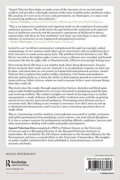 Overcoming Social Division is not another book about dying democracies, because horror scenarios don't make you act. Instead, it is an optimistic response on what can be done, and about how we can coexist in fragmented and polarised societies. Anatol Valerian Itten explains how public conflict resolution, civic fusion and mediative decision making help us re-learn the ability to find common ground on controversial issues with our fellow citizens, whom we tend to assume believe more extreme things than they really do.