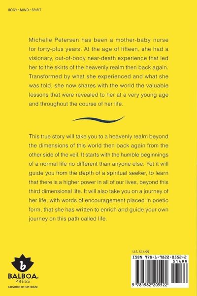 Michelle Petersen has been a mother-baby nurse for forty-plus years. At the age of fifteen, she had a visionary, out-of-body near-death experience that led her to the skirts of the heavenly realm then back again. Transformed by what she experienced and what she was told, she now shares with the world the valuable lessons that were revealed to her at a very young age and throughout the course of her life.