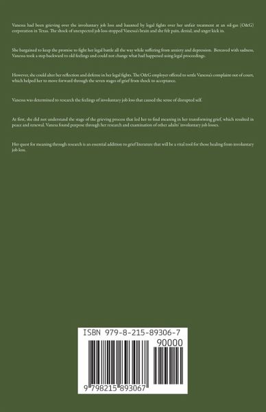 Vanessa had been grieving over the involuntary job loss and haunted by legal fights over her unfair treatment at an oil-gas (O&G) corporation in Texas. The shock of unexpected job loss stopped Vanessa's brain and she felt pain, denial, and anger kick in. She bargained to keep the promise to fight her legal battle all the way while suffering from anxiety and depression. Bereaved with sadness, Vanessa took a step backward to old feelings and could not change what had happened using legal proceedings. However, she could alter her reflection and defense in her legal fights. The O&G employer offered to settle Vanessa's complaint out of court, which helped her to move forward through the seven stages of grief from shock to acceptance. Vanessa was determined to research the feelings of involuntary job loss that caused the sense of disrupted self. At first, she did not understand the stage of the grieving process that led her to find meaning in her transforming grief, which resulted in peace and renewal. Vanesa found purpose through her research and examination of other adults' involuntary job losses. Her quest for meaning through research is an essential addition to grief literature that will be a vital tool for those healing from involuntary job loss.