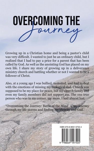 Growing up in a Christian home and being a pastor's child was very difficult. I wanted to just be an ordinary child, but I realized that I had to pay a price for a parent that has been called by God. As well as the anointing God has placed on my own life. I share my story of growing up in a deliverance ministry church and battling whether or not I wanted to be a follower of Christ. Also, at a young age I was bullied, molested, and had to deal with the emotions of missing my biological dad. Church was supposed to be my place for peace, but my church family and even my family members did not support me. The one true person who was in my corner, my mom, I had almost lost. "Overcoming the Journey: Battle of the Mind" is my journey through my life storms and finding my identity and God.