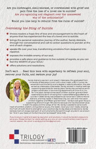 Are you distraught, shell-shocked, or overwhelmed with grief and pain from the loss of a loved one to suicide? Are you agonizing and stagnant over the unanswered why of the unthinkable? Would you like help to rebuild from the ruins of suicide? Overcoming the Sting of Suicide: -throws readers a hope-line of love and encouragement to the heart of anyone that has experienced the loss of a loved one to suicide. -brings the personal restorative journey of the author, Sandy Aletraris, through her conversational and call-to-action questions to ponder at the end of each chapter. -speaks life over your loss, transforming emotions from despaired into repaired. -exposes the invisible enemy of our soul. -provides a safe place and guidance to live outside of regrets, so you can feel the WORTH of your SOUL! -offers solutions and resolutions. Don't wait . . . Read this book with expectancy to refresh your soul, recover your faith, and restore your joy!