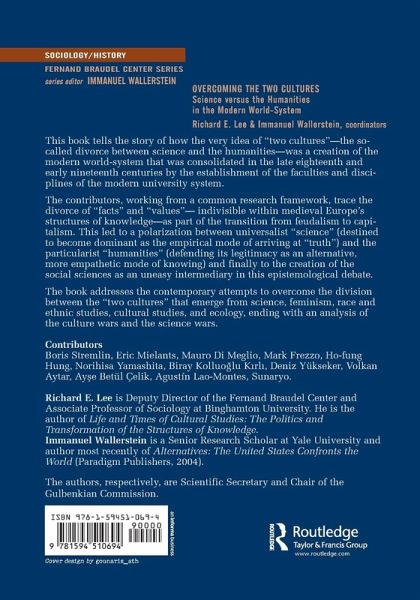 Chapter 1 Introduction: The Two Cultures Richard E. Lee Immanuel Wallerstein; Part I Historical Construction of the Two Cultures; Chapter 2 Constructing Authority: The Rise of Science in the Modern World Boris Stremlin; Chapter 3 Reaction and Resistance: The Natural Sciences and the Humanities 1789-1945 Eric Mielants; Chapter 4 The Social Sciences and Alternative Disciplinary Models Mauro Di Meglio; Chapter 5 The Ambivalent Role of Psychology and Psychoanalysis Mark Frezzo; Chapter 6 Orientalism and Area Studies: The Case of Sinology Ho-fung Hung; Part II Contemporary Challenges in and to the Structures of Knowledge; Chapter 7 Complexity Studies Richard E. Lee; Chapter 8 Science Studies Norihisa Yamashita; Chapter 9 The Cultural Turn in the Social Sciences and Humanities Biray Kolluo?lu K?rl? Deniz Yükseker; Chapter 10 Gender: Feminism and Women's Studies Volkan Aytar Ay?e Betül Çelik; Chapter 11 Regional Categories of Analysis: Latin/o Americanisms Agustín Lao-Montes; Chapter 12 Environment and Ecology: Concepts and Movements Sunaryo; Chapter 13 The "Culture Wars" and the "Science Wars" Richard E. Lee; Chapter 14 Conclusion? Immanuel Wallerstein;