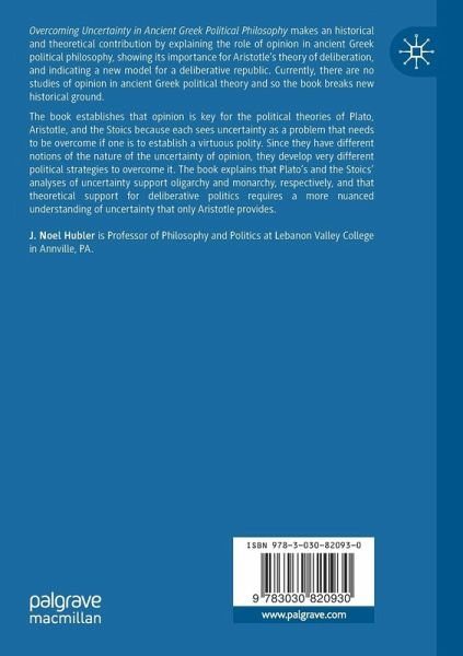 Overcoming Uncertainty in Ancient Greek Political Philosophy makes an historical and theoretical contribution by explaining the role of opinion in ancient Greek political philosophy, showing its importance for Aristotle's theory of deliberation, and indicating a new model for a deliberative republic. Currently, there are no studies of opinion in ancient Greek political theory and so the book breaks new historical ground.