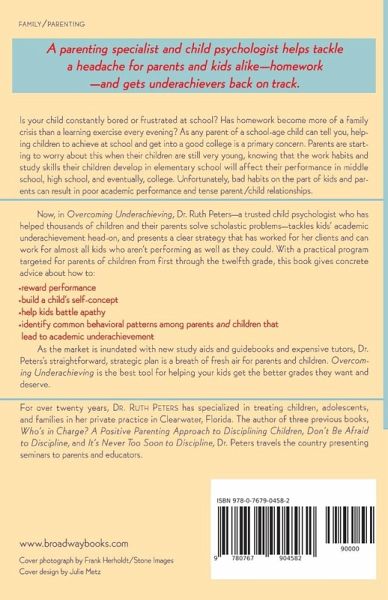 A parenting specialist and child psychologist helps tackle a headache for parents and kids alike--homework--and gets underachievers back on track. Is your child constantly bored or frustrated at school? Has homework become more of a family crisis than a learning exercise every evening? As any parent of a school-age child can tell you, helping children to achieve at school and get into a good college is a primary concern. Parents are starting to worry about this when their children are still very young, knowing that the work habits and study skills their children develop in elementary school will affect their performance in middle school, high school, and eventually, college. Unfortunately, bad habits on the part of kids and parents can result in poor academic performance and tense parent/child relationships. Now, in Overcoming Underachieving, Dr. Ruth Peters--a trusted child psychologist who has helped thousands of children and their parents solve scholastic problems--tackles kids' academic underachievement head-on, and presents a clear strategy that has worked for her clients and can work for almost all kids who aren't performing as well as they could. With a practical program targeted for parents of children from first through the twelfth grade, this book gives concrete advice about how to: -reward performance -build a child's self-concept -help kids battle apathy -identify common behavioral patterns among parents and children that lead to academic underachievement As the market is inundated with new study aids and guidebooks and expensive tutors, Dr. Peters's straightforward, strategic plan is a breath of fresh air for parents and children. Overcoming Underachieving is the best tool for helping your kids get the better grades they want and deserve.