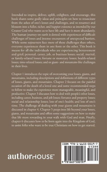 Intended to inspire, deliver, uplift, enlighten, and encourage, this book shares some godly ideas and principles on how to resuscitate from the ashes of one's losses and challenges, and to resurrect and blossom into a fuller, richer, and happier existence as intended by our Creator God who wants us to have life and have it more abundantly. The human journey on earth is dotted with experiences of difficult challenges of losses and intense encounters of unexpected barriers. While some sojourners face more of these challenges than others, everyone experiences them in one form or the other. This book is meant for all the individuals who are experiencing bereavement and grief; personal, career, job, or business losses; social, marital, or family-related losses; fortune or monetary losses; health-related losses; time-related losses; and or giant- and mountain-like challenges in their lives. Chapter 1 introduces the topic of overcoming your losses, giants, and mountains, including descriptions and definitions of different types of losses, giants, and mountains. Chapter 2 focuses on the painful occasion of the death of a loved one and some recommended steps to follow to make the experience more manageable, meaningful, and productive. Chapter 3 discusses how to deal with people's other losses, including career, business, and job losses; fortunes and property losses; social and relationship losses; loss of one's health; and loss of one's time. The challenge of dealing with your giants and mountains is discussed in chapter 4. Chapter 5 peeps into life beyond your losses, giants, and mountains and offers some suggestions on how to make that life more rewarding in your walk with God and man. Finally, chapter 6 discusses how to be born again into the Kingdom of God, to assist folks who want to be true Christians on how to get started.