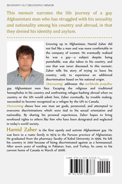 Growing up in Afghanistan, Hamid Zaher did not feel like a man and was more comfortable in the company of women. He eventually realized he was a gay-a subject despite being punishable, was also taboo in his country, and one that was never discussed. In this memoir, Zaher tells his story of trying to leave his country, only to experience an additional discrimination based on his national origin. Overcoming addresses the worldwide prejudice gay Afghanistani men face. Escaping the religious and traditional homophobia and confronting refugee-bashing when no country or the UN would admit him, Zaher eventually, by trouble making, succeeded to become recognized as a refugee by the UN to Canada. Overcoming shows how one man set goals, persevered, and attempted to overcome discriminations which were tied to his sexual orientation and nationality. By sharing his personal experiences, Zaher hopes to bring newfound rights to others like him who have been denigrated and neglected in today's world society.