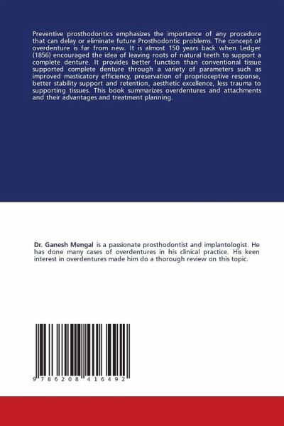 Preventive prosthodontics emphasizes the importance of any procedure that can delay or eliminate future Prosthodontic problems. The concept of overdenture is far from new. It is almost 150 years back when Ledger (1856) encouraged the idea of leaving roots of natural teeth to support a complete denture. It provides better function than conventional tissue supported complete denture through a variety of parameters such as improved masticatory efficiency, preservation of proprioceptive response, better stability support and retention, aesthetic excellence, less trauma to supporting tissues. This book summarizes overdentures and attachments and their advantages and treatment planning.