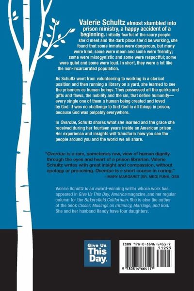 Valerie Schultz almost stumbled into prison ministry, a happy accident of a beginning. Initially fearful of the scary people she'd meet and the dark place she'd be working, she found that some inmates were dangerous, but many were kind; some were mean and some were friendly; some were misogynistic and some were respectful; some were quiet and some were loud. In short, they were a lot like the non-incarcerated population. As Schultz went from volunteering to working in a clerical position and then running a library on a yard, she learned to see the prisoners as human beings. They possessed all the quirks and gifts and flaws, the nobility and the sin, that define humanity--every single one of them a human being created and loved by God. It was no challenge to find God in all things in prison, because God was palpably everywhere. In Overdue, Schultz shares what she learned and the grace she received during her fourteen years inside an American prison. Her experience and insights will transform how you see the people around you and the world we all share.