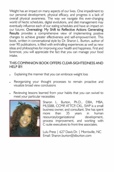 Overeating: My Shift to Reflective Actions Generating Results is a part of the Transitioning to I Can from I Can't series. Written by Dr. Sharon L. Burton, through the pages of this text, readers learn to understand weight loss, and prepare a time and action plan to affect positive change. This text is under the theoretical framework, Change management. Sharon L. Burton, Ph.D., DBA, MBA, MLSSBB, CCMP, ATTCP, CKL, SWP is a small business owner, consultant, and interdisciplinary scholar. She has spent more than 35 years in human resources/organizational development, process improvement, information technology, academics, and working with C-suite executives to front-line associates. Dr. Burton holds the following earned degrees: Ph.D. in Cybersecurity Leadership; Doctorate of Business Administration in Quality System Management (Business Process Improvement); MBA in Human Resource Management; MBA in Business Management; BS in Criminology. Further, she holds certifications in Lean Six Sigma Black Belt, Human Capital Strategy, Strategic Workforce Planning, as well as Kirkpatrick Four Levels Evaluation.