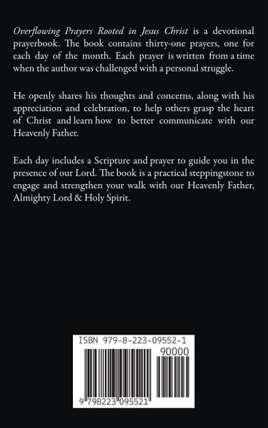 Overflowing Prayers Rooted in Jesus Christ is a devotional prayerbook. The book contains thirty-one prayers, one for each day of the month. Each prayer is written from a time the author was challenged with a personal struggle and turned for help from our Triune God. He openly shares his thoughts and concerns, along with his appreciation and celebration, to help others grasp the heart of Christ and learn how to better communicate with our Heavenly Father. This book is a practical steppingstone to guide you in the presence of our Lord. Use it to engage and strengthen your walk with our Heavenly Father, Almighty Lord & Holy Spirit. Overflowing Prayers Rooted in Jesus Christ is simply a jumpstart for you to develop a more intimate, meaningful, and stronger relationship with a Perfect Dad.
