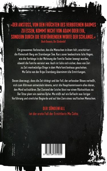 Liebe bedeutet, die Einsamkeit des anderen erträglich zu machen.Zorn hingegen erzeugt so oder so eine Zukunft.Der Anstoß, von den Früchten des verbotenen Baumes zu essen, kommt nicht von Adam oder Eva, sondern durch die verführenden Worte der Schlange.(Buch Genesis, Der Sündenfall)Ein grausames Verbrechen, das die Menschen in Atem hält, erschüttert die Kleinstadt Berg am Starnberger See. Mo Celta von der Kripo Starnberg übernimmt die Ermittlungen. Kurz darauf wendet sich Alexander Martin an die Kripo Starnberg.Im Befragungszimmer trifft er auf Mo Celta, die eine Vergewaltigungsserie und einen Mord aufklären muss. Mo erfährt von Intrigen, Lügen, von einer Affäre und einer Hasenmaske. Davon überzeugt, dass die Zeit drängt und der Fall, der unfassbar Böses verheißt, sich zum Albtraum entwickeln könnte, setzt die Hauptkommissarin alles daran, den Mord aufzuklären. Mo stößt auf ein Geflecht aus listiger Verführung und sinnlicher Begierde und auf den Zorn eines teuflischen Menschen.Fast ohne dass Mo es merkt, verbindet sich das Tasten nach dem Sinn einer Tat mit einer geheimnisvollen, rätselhaften Geschichte um ein Geheimnis.DER SÜNDENFALL ist der erste Fall der Ermittlerin Mo Celta.