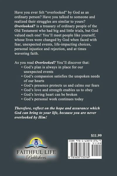 Have you ever felt "overlooked" by God as an ordinary person? Have you talked to someone and realized their struggles are similar to yours? Overlooked? is a treasury of ordinary people of the Old Testament who had big and little trials, but God valued each one! You'll meet people like yourself, whose lives were changed by God when faced with fear, unexpected events, life-impacting choices, personal injustice and rejection, and at times wavering faith. As you read Overlooked? You'll discover that: God's plan is always in place for our unexpected events God's compassion satisfies the unspoken needs of our hearts God's presence protects us and calms our fears God's love and strength enables us to obey God's loving heart can be broken God's personal work continues today. Therefore, reflect on the hope and assurance which God can bring to your life, because you are never overlooked by Him!