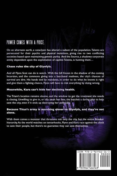 Power comes with a price. On an alternate earth, a cataclysm has altered a subset of the population. Talents are persecuted for their psychic and physical mutations, giving rise to two conflicting societies based upon maintaining genetic purity. And the Source, a shadowy corporate entity dependent upon the exploitation of captive Talents, is hunting them... Chaos rules the city of Glynfyls. And all Flynn Scot can do is watch. With the hill frozen in the shadow of the coming Incursion, and the commons giving into a bacchanal madness, the city's chances of survival are dire. His hands tied by mandates, in order to do what he knows is right and give them a fighting chance, Flynn will have to risk everything by doing wrong. Meanwhile, Kara can't hide her declining health. The Triam's location remains elusive, and the window to get the treatment she needs is closing. Unwilling to give in, or idly await her fate, she hatches a daring plan to help save the city, even if it ends up destroying her politically. Because Titus's army is marching closer to Glynfyls, and they're not alone. With them comes a monster that threatens not only the city, but the entire Breaker hierarchy. As the world watches on tenterhooks, Flynn and Kara race against the clock to save their people, but there's no guarantee they can save themselves.