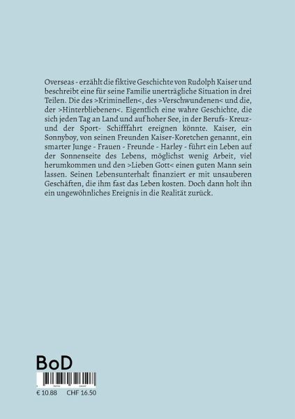 Overseas - erzählt die fiktive Geschichte von Rudolph Kaiser und beschreibt eine für seine Familie unerträgliche Situation in drei Teilen. Die des >Kriminellen<, des >Verschwundenen< und die, der >Hinterbliebenen<. Eigentlich eine wahre Geschichte, die sich jeden Tag an Land und auf hoher See, in der Berufs- Kreuz- und der Sport- Schifffahrt ereignen könnte. Kaiser, ein Sonnyboy, von seinen Freunden Kaiser-Koretchen genannt, ein smarter Junge - Frauen - Freunde - Harley - führt ein Leben auf der Sonnenseite des Lebens, möglichst wenig Arbeit, viel herumkommen und den >Lieben Gott< einen guten Mann sein lassen. Seinen Lebensunterhalt finanziert er mit unsauberen Geschäften, die ihm fast das Leben kosten. Doch dann holt ihn ein ungewöhnliches Ereignis in die Realität zurück.