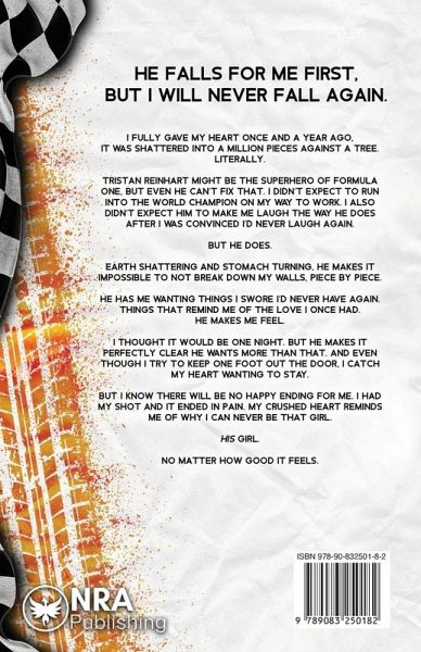 HE FALLS FOR ME FIRST, BUT I WILL NEVER FALL AGAIN. I fully gave my heart once and a year ago, it was shattered into a million pieces against a tree. Literally. Tristan Reinhart might be the superhero of Formula One, but even he can't fix that. I didn't expect to run into the World Champion on my way to work. I also didn't expect him to make me laugh the way he does after I was convinced I'd never laugh again. But he does. Earth-shattering and stomach-turning, he makes it impossible to not break down my walls, piece by piece. He has me wanting things I swore I'd never have again. Things that remind me of the love I once had. He makes me feel. I thought it would be one night. But he makes it perfectly clear he wants more than that. And even though I try to keep one foot out the door, I catch my heart wanting to stay. But I know there will be no happy ending for me. I had my shot and it ended in pain. My crushed heart reminds me of why I can never be that girl. His girl. No matter how good it feels.