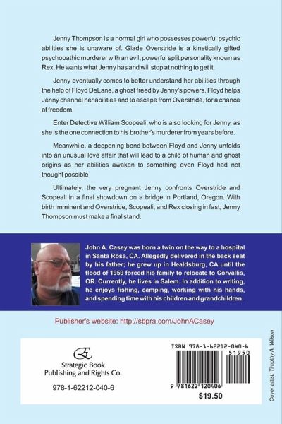 Jenny Thompson is a normal girl who possesses powerful psychic abilities she is unaware of. Glade Overstride is a kinetically gifted psychopathic murderer with an evil, powerful split personality known as Rex. He wants what Jenny has and will stop at nothing to get it. Jenny eventually comes to better understand her abilities through the help of Floyd DeLane, a ghost freed by Jenny's powers. Floyd helps Jenny channel her abilities and to escape from Overstride, for a chance at freedom. Enter Detective William Scopeali, who is also looking for Jenny, as she is the one connection to his brother's murderer from years before. Meanwhile, a deepening bond between Floyd and Jenny unfolds into an unusual love affair that will lead to a child of human and ghost origins as her abilities awaken to something even Floyd had not thought possible Ultimately, the very pregnant Jenny confronts Overstride and Scopeali in a final showdown on a bridge in Portland, Oregon. With birth imminent and Overstride, Scopeali, and Rex closing in fast, Jenny Thompson must make a final stand. John A. Casey was born a twin on the way to a hospital in Santa Rosa, CA. Allegedly delivered in the back seat by his father; he grew up in Healdsburg, CA until the flood of 1959 forced his family to relocate to Corvallis, OR. Currently, he lives in Salem. In addition to writing, he enjoys fishing, camping, working with his hands, and spending time with his children and grandchildren. Publisher's website: http://sbpra.com/JohnACasey