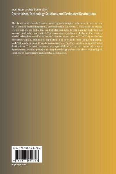 This book meticulously focuses on seeing technological solutions of overtourism on decimated destinations from a comprehensive viewpoint. Considering the present crisis situation, the global tourism industry is in need to formulate revised strategies to recover and to be more resilient. The book creates a platform to deliberate the measures needed to be taken to tackle the issue of this most recent crisis of COVID-19 on the lens of overtourism and technology application. The book adds some unique suggestions to direct a new outlook towards overtourism, technology solutions and decimated destinations. This book discusses the responsibilities of tourists towards decimated destinations as well as provides in-deep knowledge and debates about technological solutions to overtourism in decimated destinations.