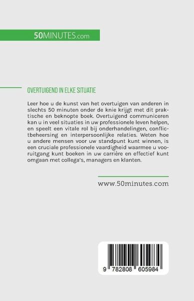 Leer hoe u de kunst van het overtuigen van anderen in slechts 50 minuten onder de knie krijgt met dit praktische en beknopte boek. Overtuigend communiceren kan u in veel situaties in uw professionele leven helpen, en speelt een vitale rol bij onderhandelingen, conflictbeheersing en interpersoonlijke relaties. Weten hoe u andere mensen voor uw standpunt kunt winnen, is een cruciale professionele vaardigheid waarmee u vooruitgang kunt boeken in uw carrière en effectief kunt omgaan met collega's, managers en klanten. In dit boek leert u hoe de kunst van het overtuigen van anderen u kan helpen bij productpresentaties, marketing en het zoeken naar een baan. Het bevat ook nuttige tips om krachtige argumenten te construeren en te leveren en de valkuilen die u moet vermijden wanneer u anderen probeert te overtuigen, zodat u alles in handen hebt om uw communicatie- en onderhandelingsvaardigheden te verbeteren.