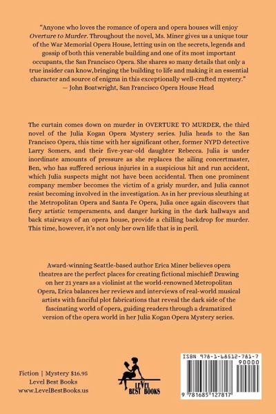 The curtain comes down on murder in OVERTURE TO MURDER, the third novel of the Julia Kogan Opera Mystery series. Julia heads to the San Francisco Opera, this time with her significant other, former NYPD detective Larry Somers, and their five-year-old daughter Rebecca. Julia is under inordinate amounts of pressure as she replaces the ailing concertmaster, Ben, who has suffered serious injuries in a suspicious hit-and-run accident, which Julia suspects might not have been accidental. Then, one prominent company member becomes the victim of a grisly murder, and Julia cannot resist becoming involved in the investigation. As in her previous sleuthing at the Metropolitan Opera and Santa Fe Opera, Julia once again discovers that fiery artistic temperaments, and danger lurking in the dark hallways and back stairways of an opera house, provide a chilling backdrop for murder. This time, however, it's not only her own life that is in peril.